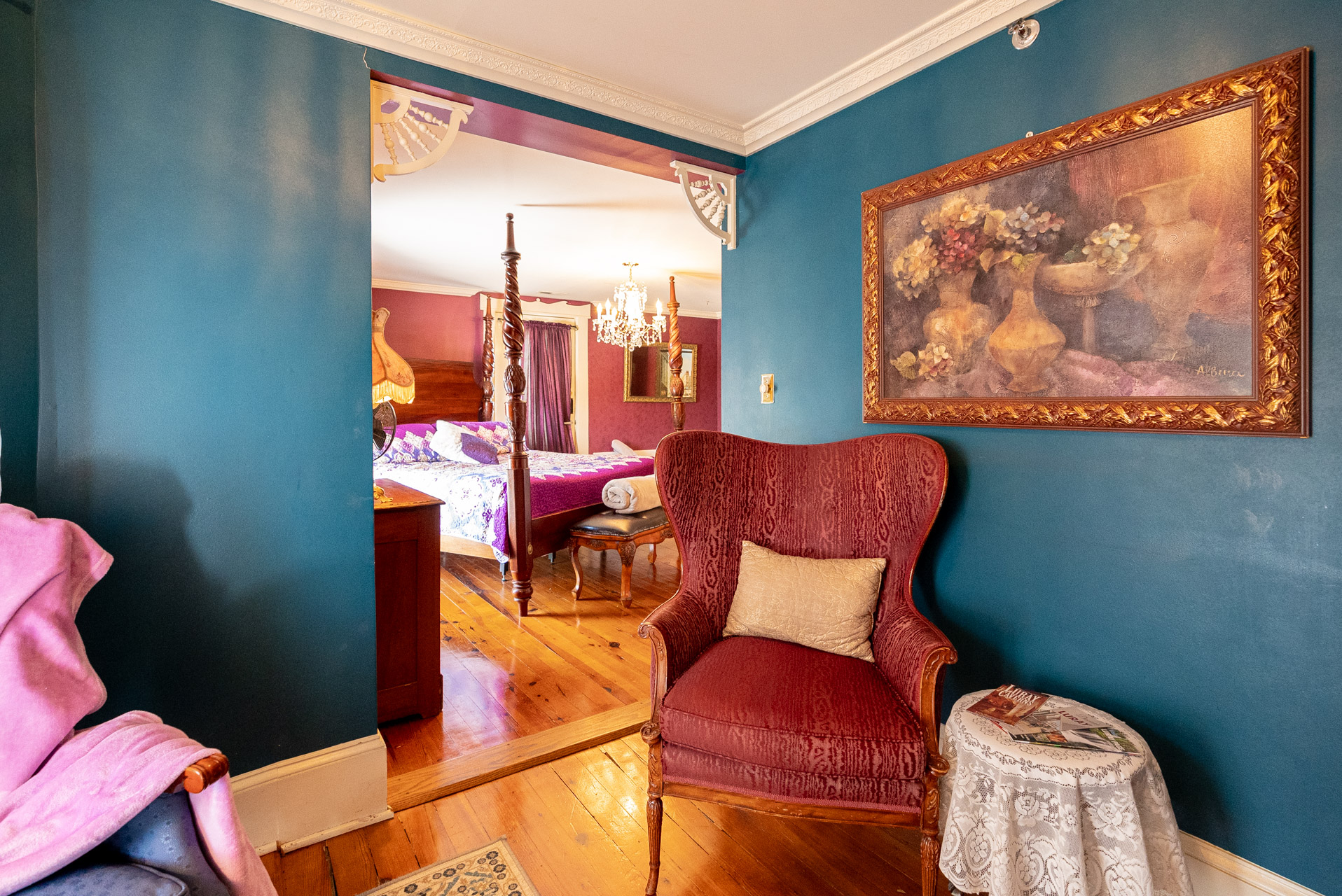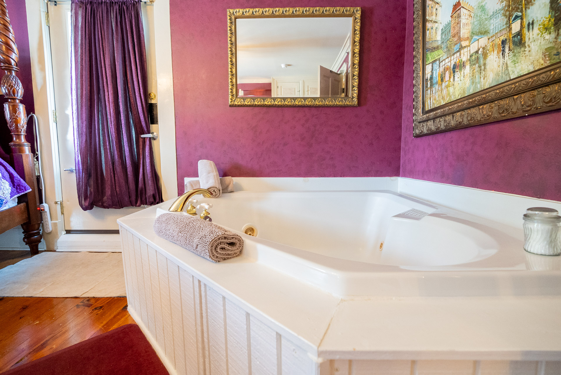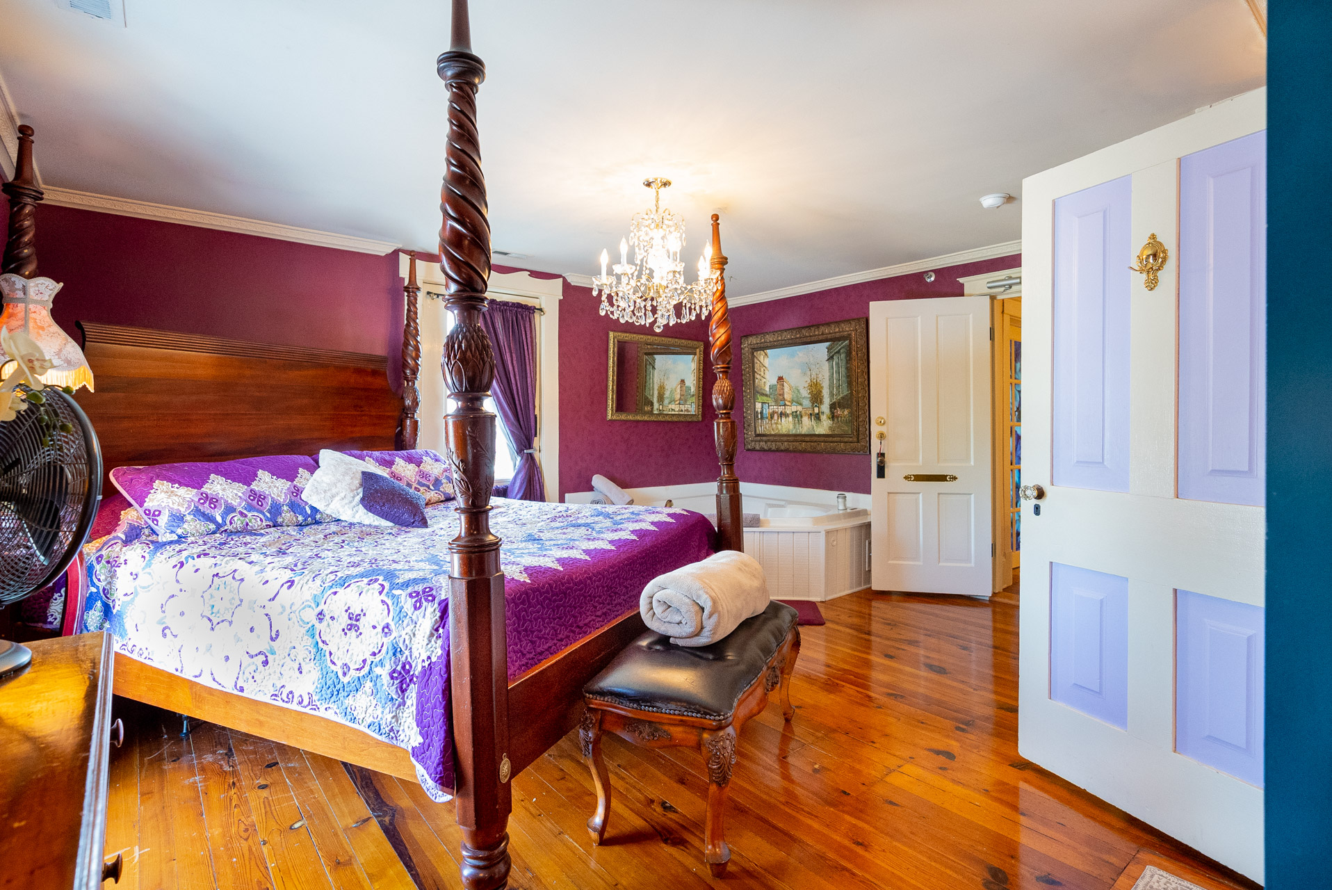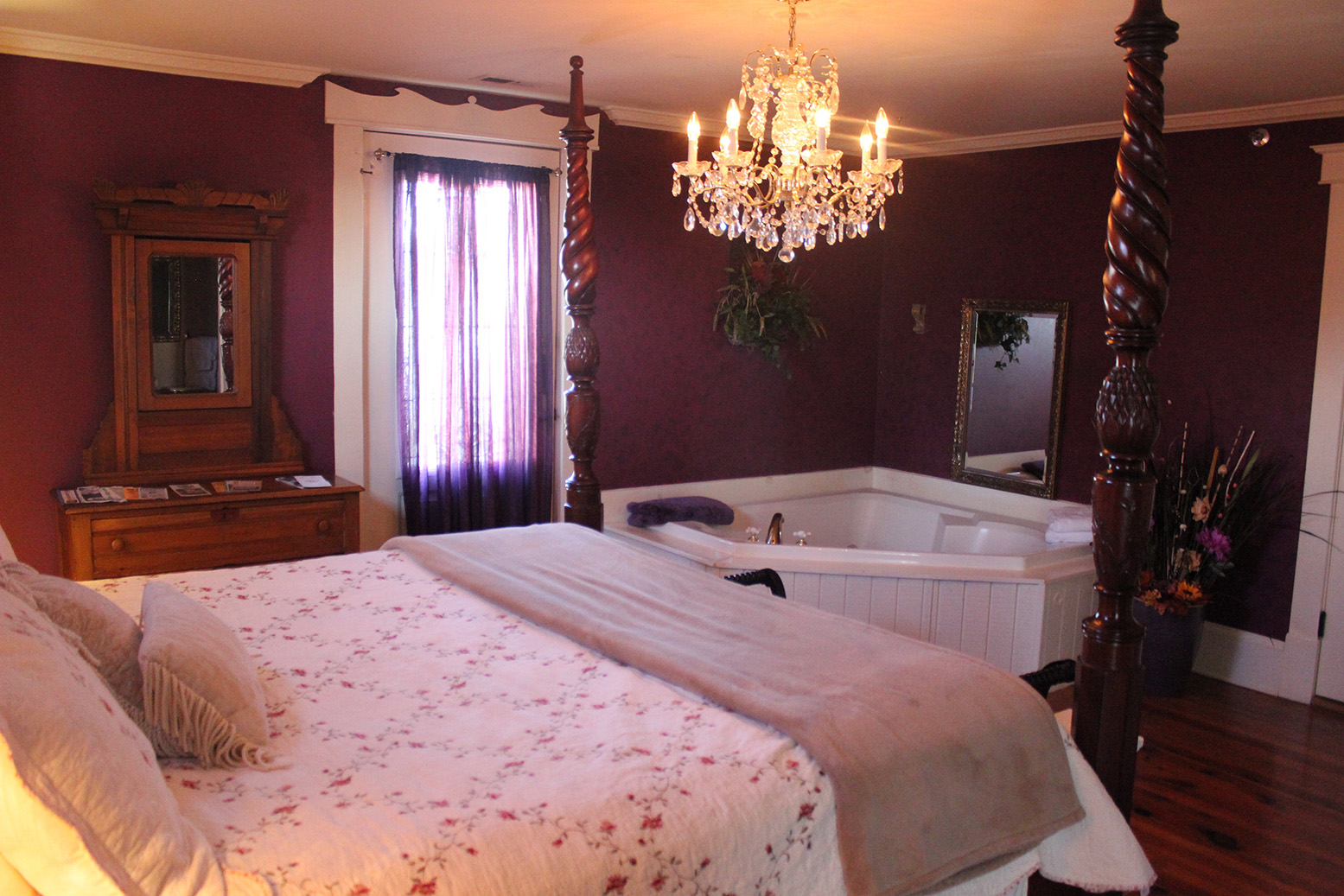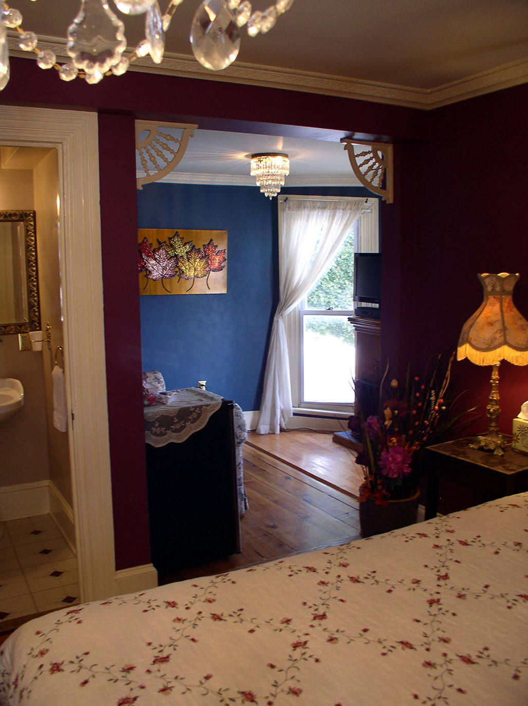 A truly luxurious retreat. You will revel in the comfort of the King Size Four Poster Bed after relaxing in the in-room “Jacuzzi for Two”. This unique suite features a quaint turret sitting room with electric fireplace, full private bath, and private outdoor balcony. Includes Gourmet Breakfast.