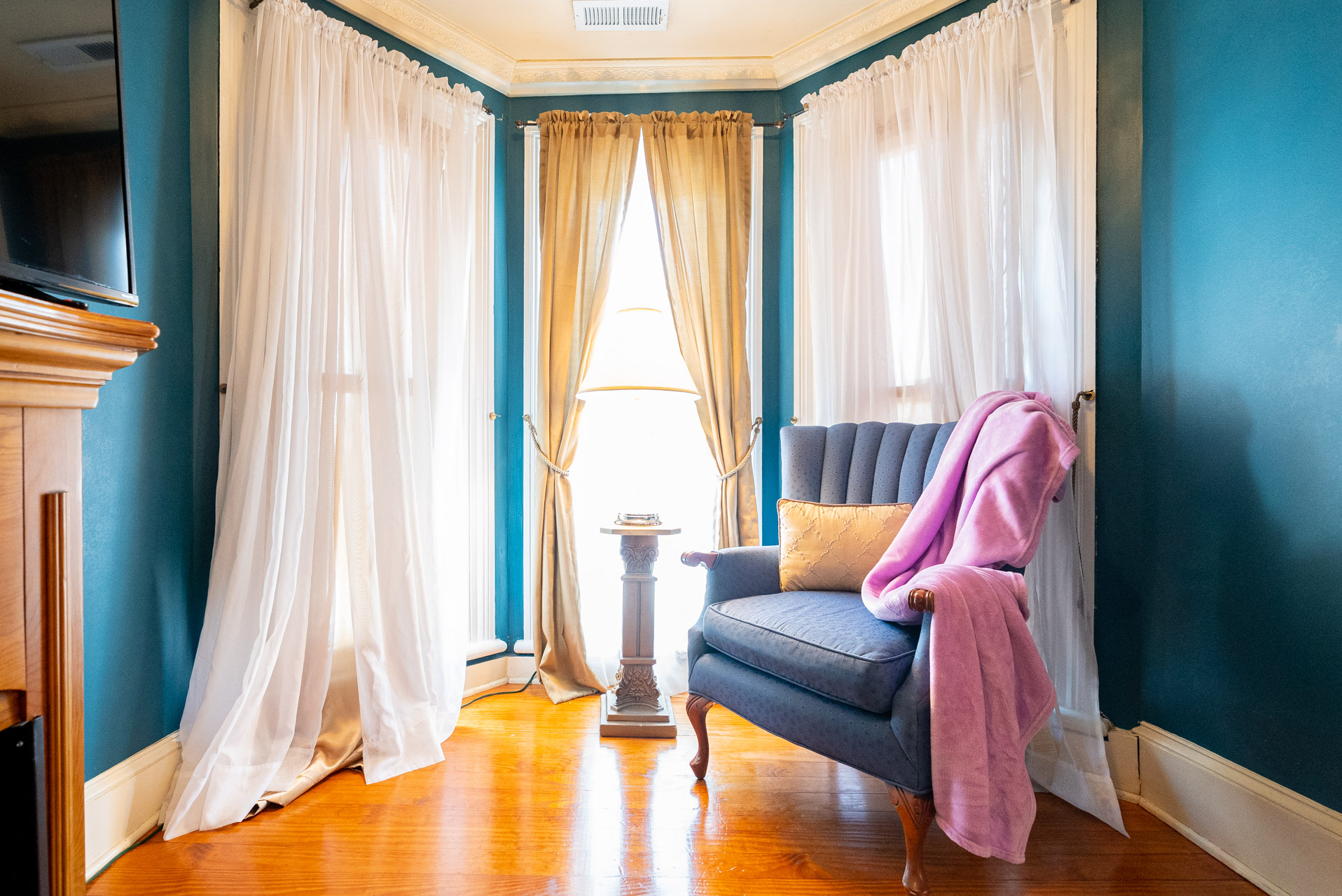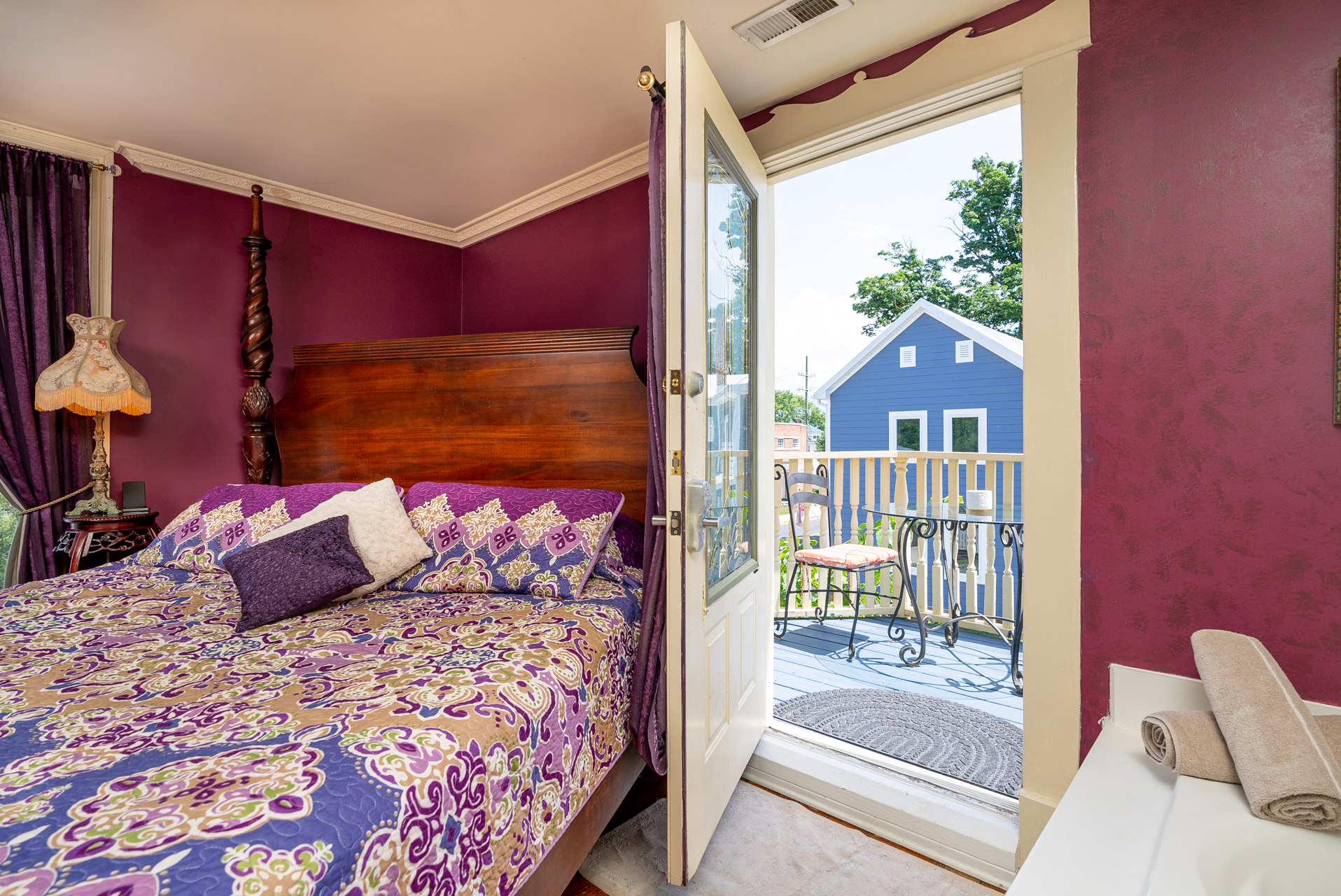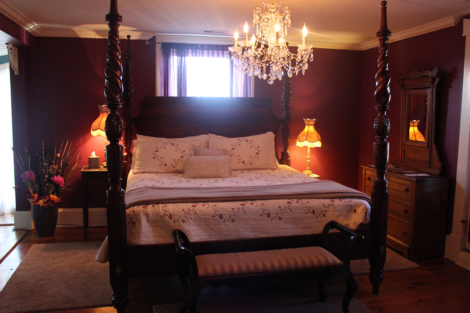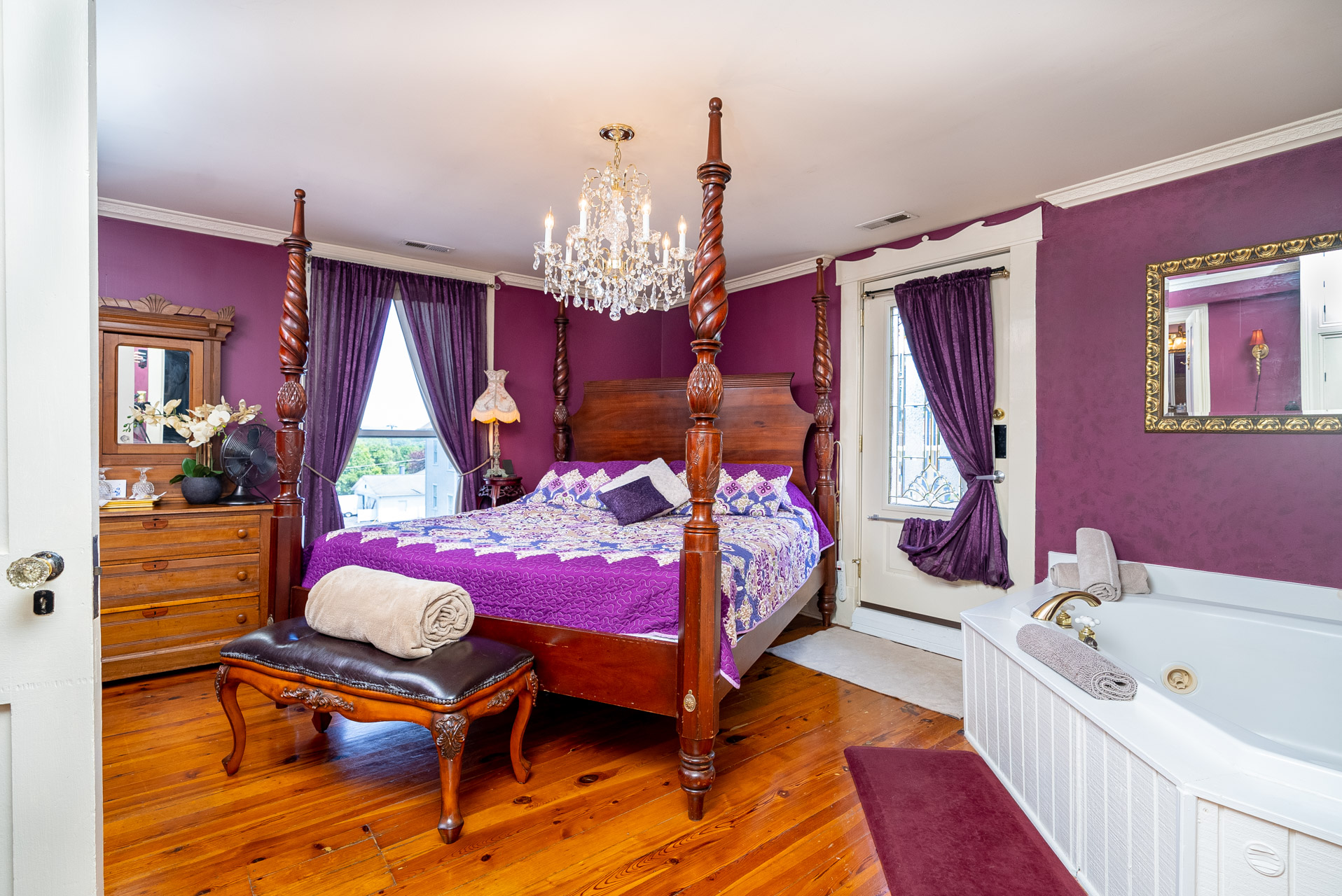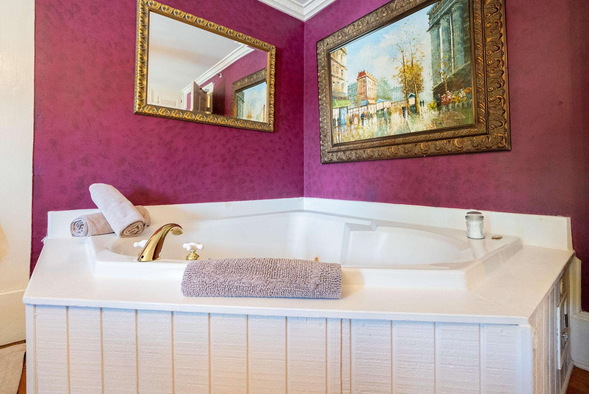 A truly luxurious retreat. You will revel in the comfort of the King Size Four Poster Bed after relaxing in the in-room “Jacuzzi for Two”. This unique suite features a quaint turret sitting room with electric fireplace, full private bath, and private outdoor balcony. Includes Gourmet Breakfast.